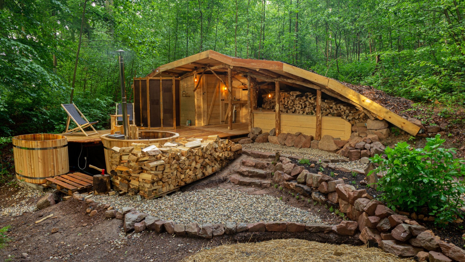 V roklince pod Treehousem jsou pro Vás umístěny privátní lázně s finskou vanou, která vám zajistí dokonalé uvolnění. Vana je spojena s terasou na které si odpočinete v lehátkách a osprchujete se teplou i studenou vodou.